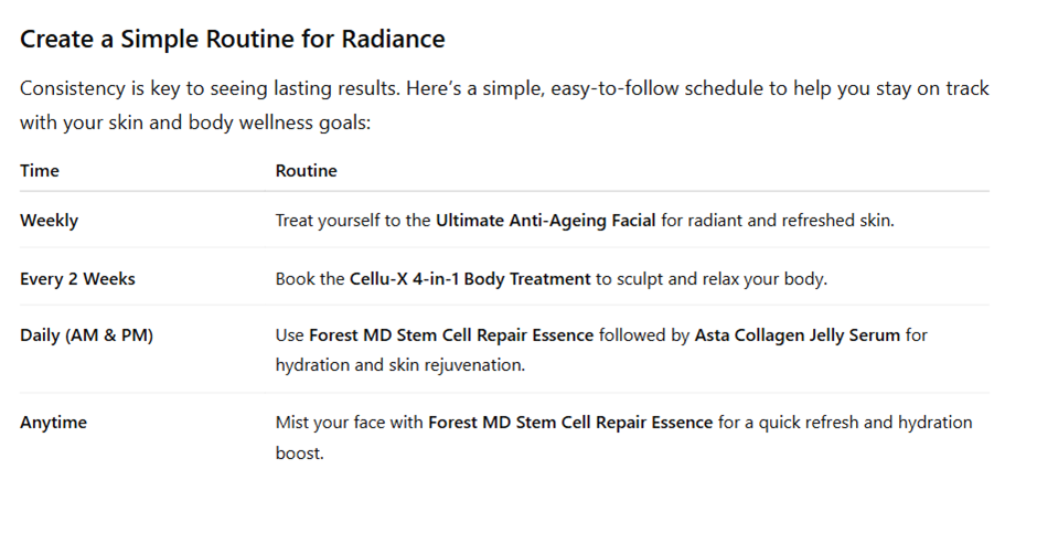 So, how do you begin? With simple yet effective treatments and products that rejuvenate and refresh, you’ll soon see your skin and body feeling revitalized and radiant. Let’s take a look at how you can restore balance with a personalised routine that promotes glowing skin and body wellness.